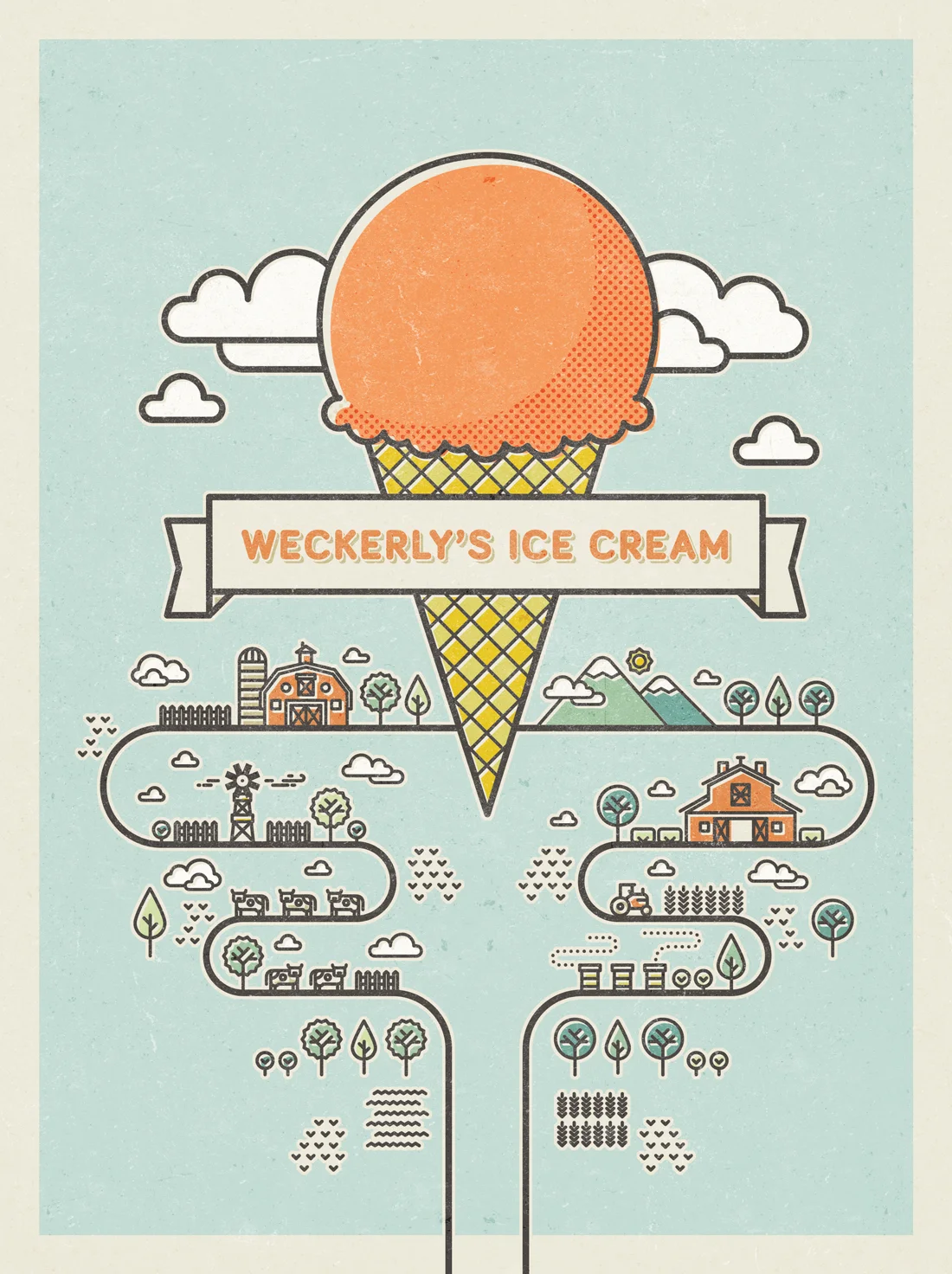 Cover and interior illustration for local Philadelphia publication, Grid Magazine. This design was created for their yearly food edition and was supposed to show how the food system in Philly works, and how Fair Food Organization is a connector from farms to retail and institutions. The secondary illustration was created for their feature on Weckerly's who make organic ice cream and showcases their journey to find the local organic dairy and other providers that set their product apart.